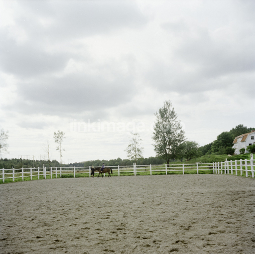 horse, ride, riders, leader, riding lesson, fence, pasture, path, track, house, greens, tree, sky, sand, clay, gravel
