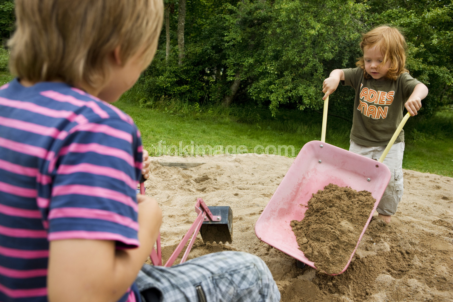 - sand, dig, cooperation, children, siblings, sandbox, play, boys, wheelbarrow, pink