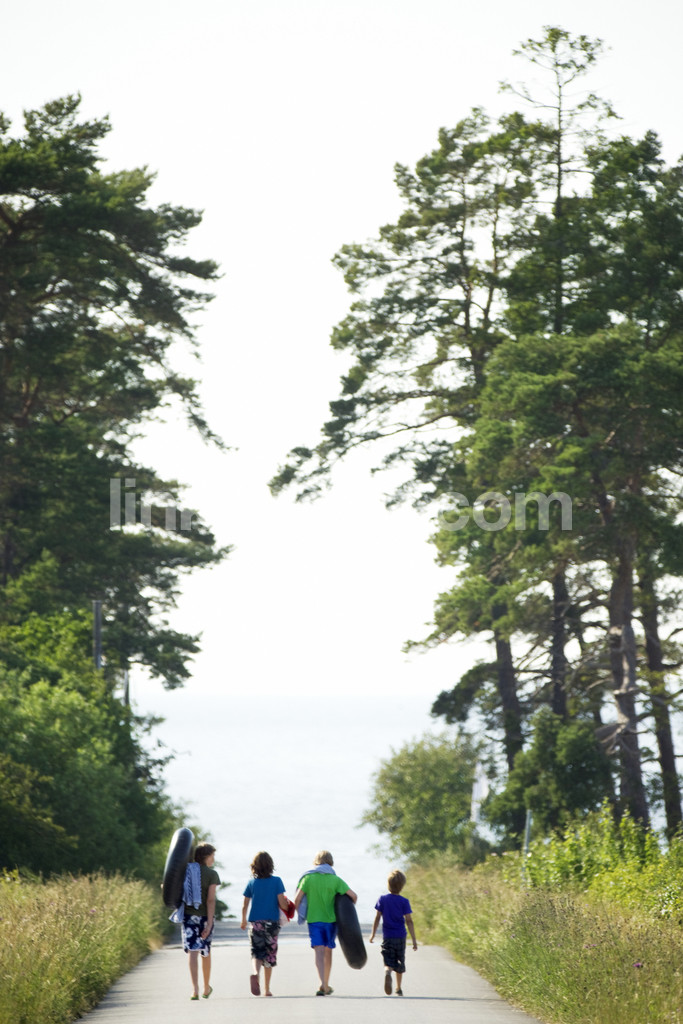 walk, children, traffic, bath, road, summer, heat, water, sea, friends, go, play, tree, forest, rubber ring, swimming ring, towels