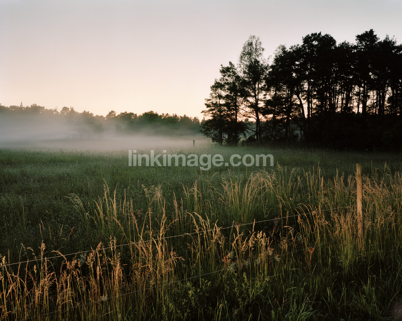 spot, fence, go, fog, tree, dawn, evening, grass, fate, haze, dusk, forest, meadow