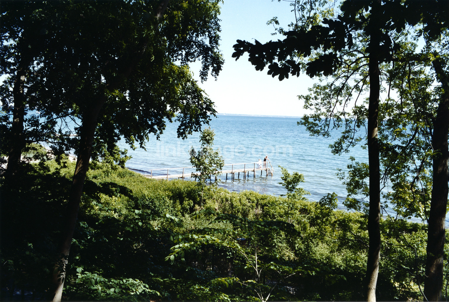 bridge, bather, summer, sea, bright blue, blue, water, forest, forest edges, greens, plants, tree, swim