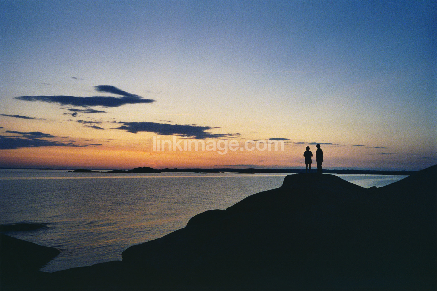 rock, silhouette, sunset, couple, two, cut, sea, water, sky, cloud, dusk, island, view, views