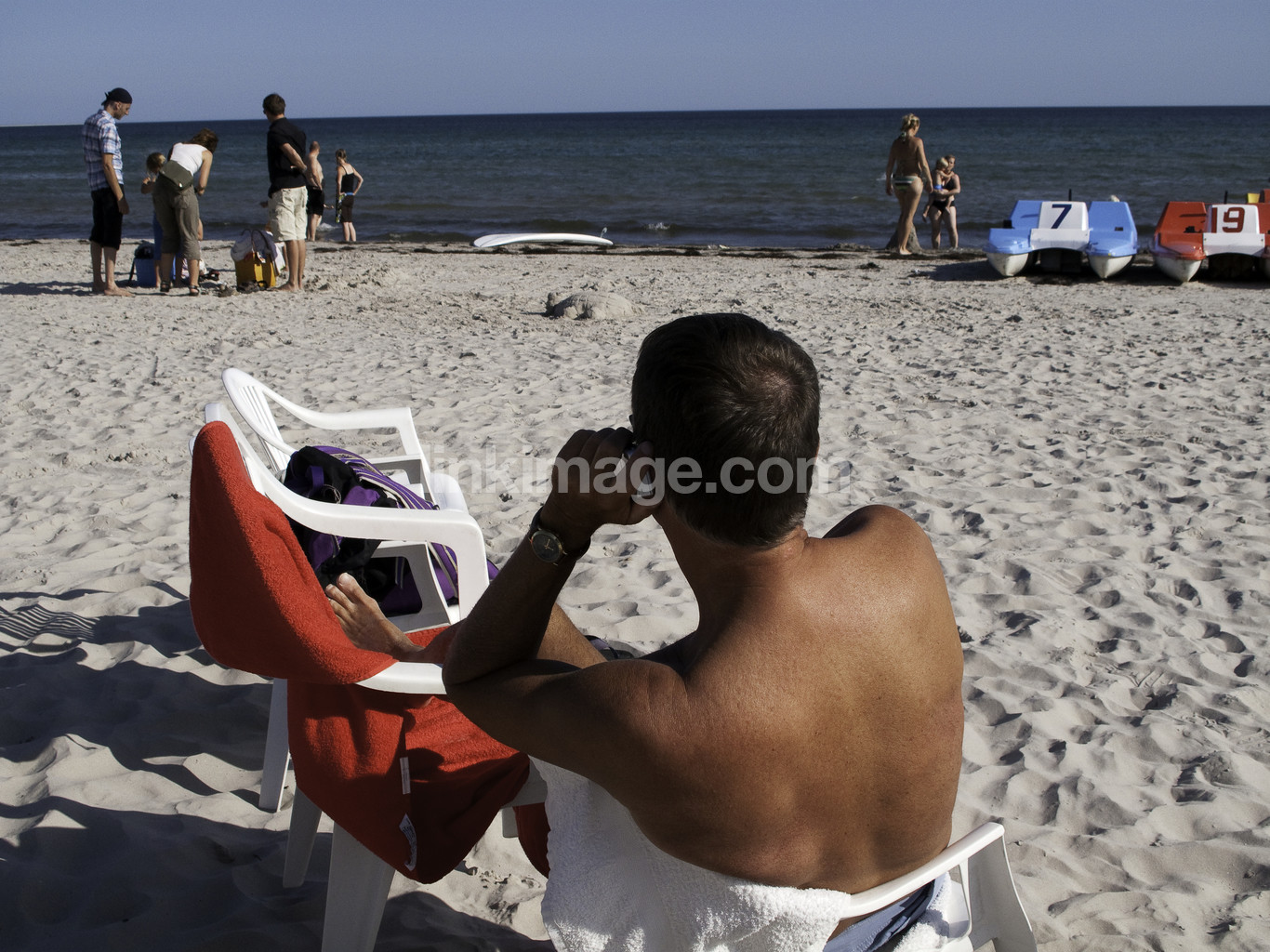 - shore, sunbathing, back, mobile, cellular phone, summer, tan, burnt, holiday, leisure, male, guy, sea
