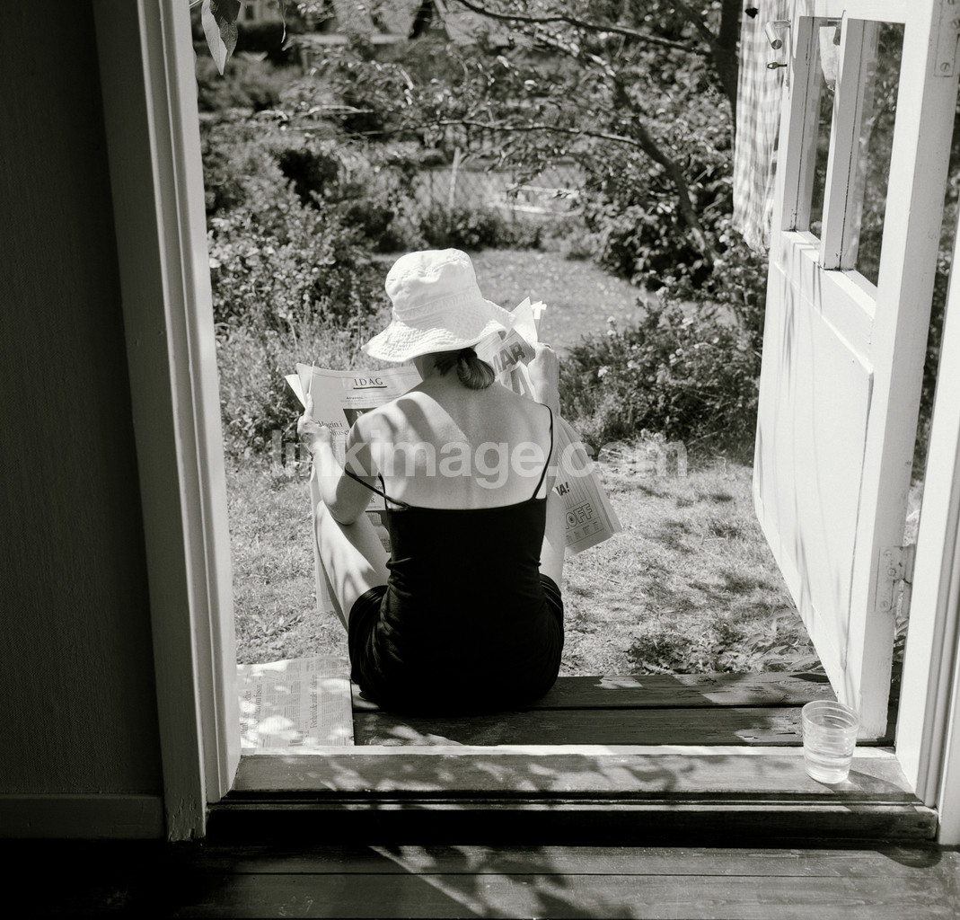 read, journal, newspaper, summer, garden, female, morning, morning, doorway, unscheduled, holiday, hat