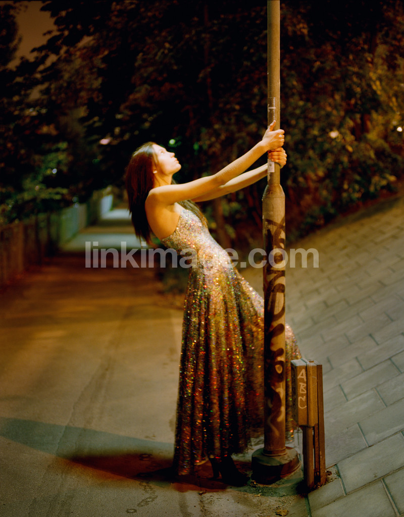 - female, evening dress, dress, sequins, party, dressed in evening dress, out, full, fill, night, late, road, bicycle path, streetlights, walk, home, go, climb, girl, outdoor living, doodle, pavement, evening