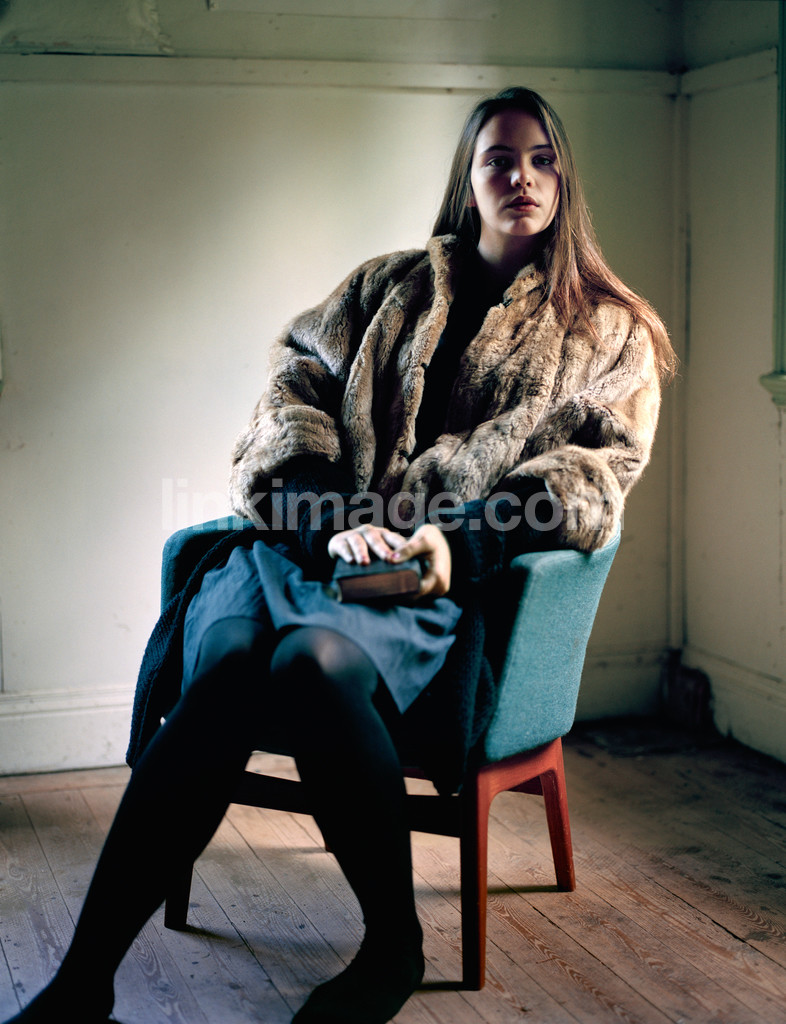 - female, girl, rest, sit, bible, hymnbook, armchair, fur, indoor, home, think, knowledge, insight, presence, house, room, religion, portrait