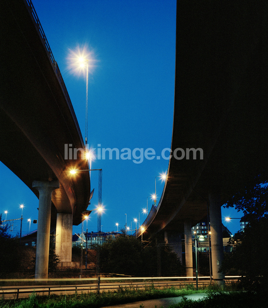 - road, street, bridge, viaduct, column, night, evening, summer, infrastructure, during, traffic, city, light, blue, two, double, couple, intervals, shared