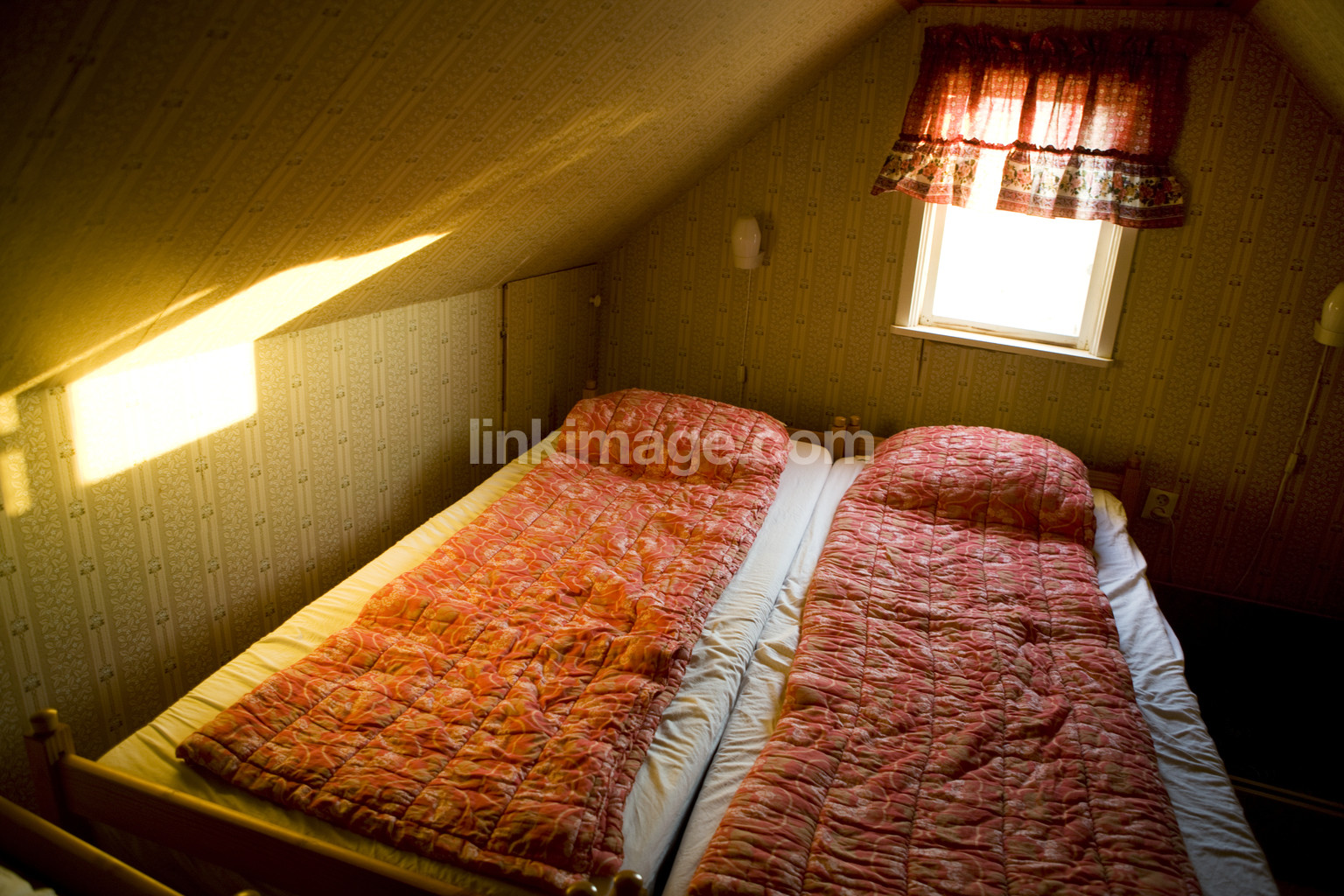 red, sun, evening, bedroom, two, double, bed, small, crowded, summer, wind, window