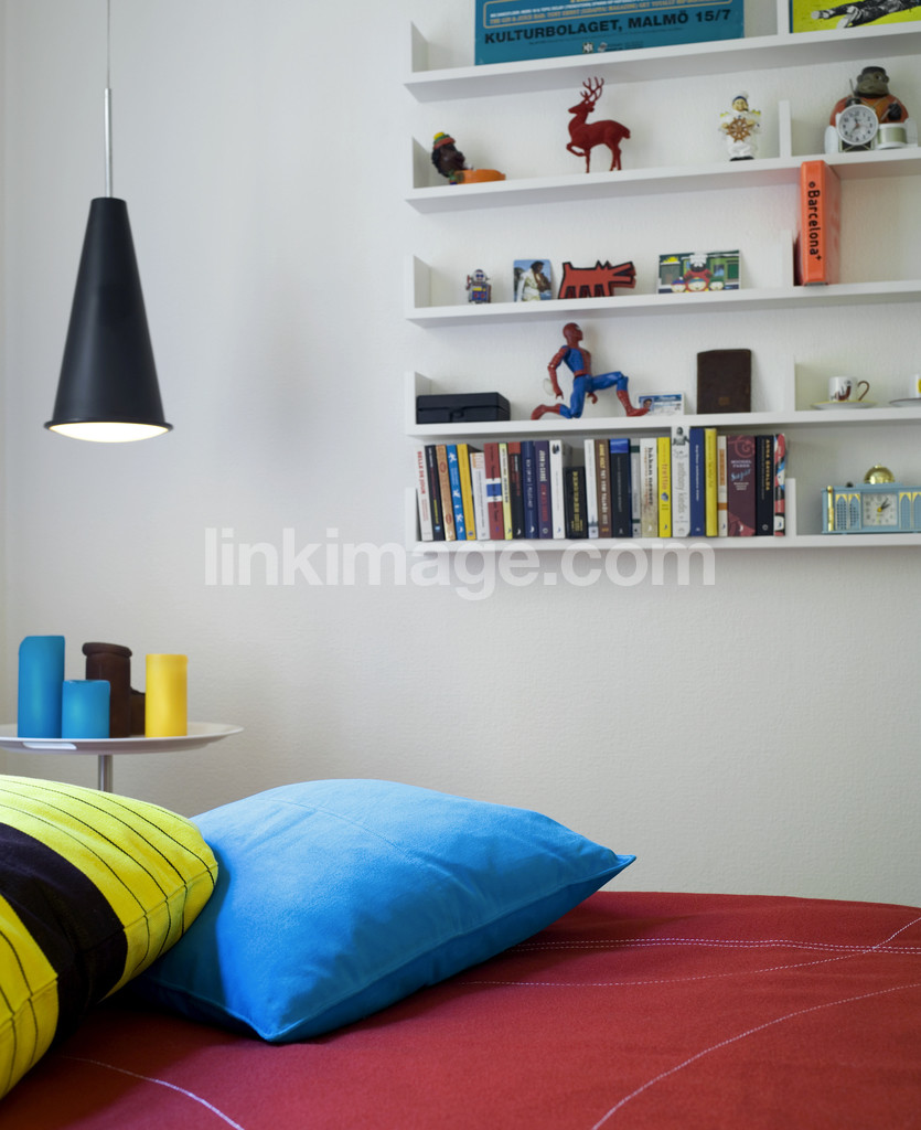 bed, room, home, shelf, interior, books, colors, bedroom, cushion, lamp, bookshelf