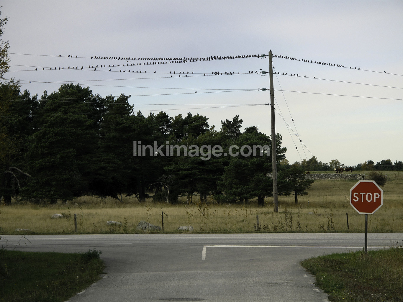 - crossroads, road sign, stop sign, telephone wires, telecommunications, el, country, country built, road, traffic, spot, tree, migratory birds, birds, fall, stop, sign