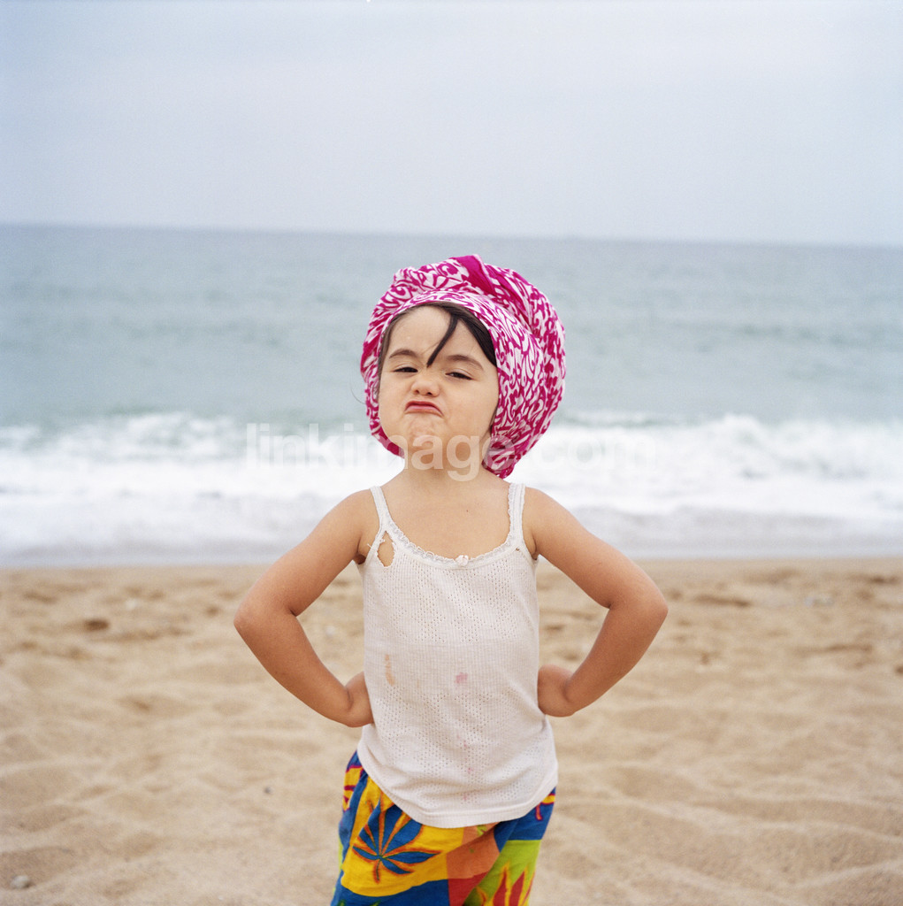 children, despite, portrait, turban, funny, humor, summer, overcast, heat, shore, girl, sea, sky, fun