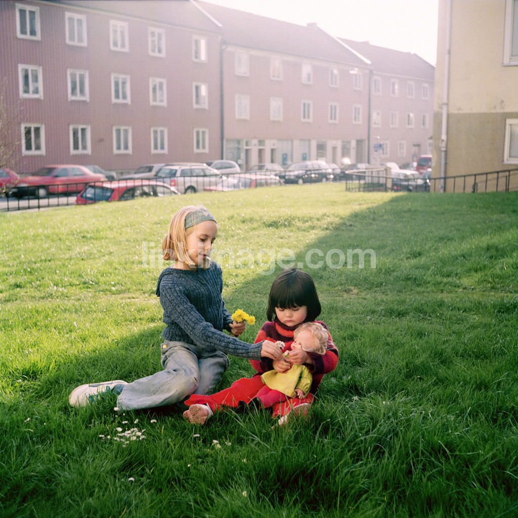 - children, role, games, dandelions, houses, functionalist building, lawn, spring, girl, siblings, friends, dock