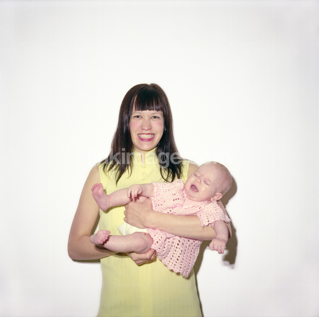 - children, female, smile, weeping, cry, teeth, yellow, pink, girls clothes, eyes, portrait, mood image, family, mother, happy, baby