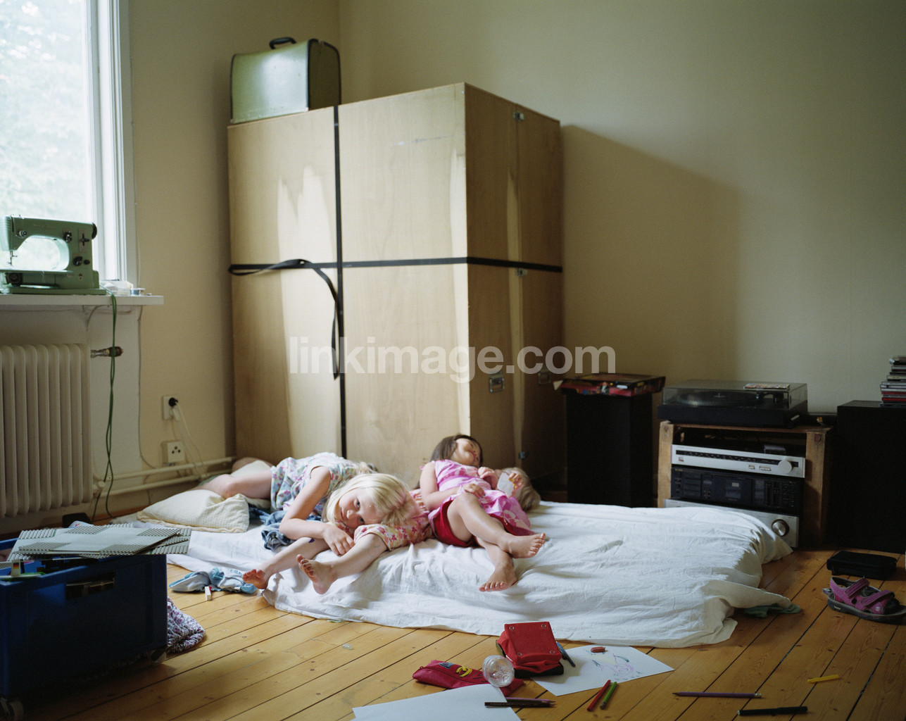 - children, girls, play, energy, fatigue, rest, mattress, room, toys, suitcase, packet, subscribe, markers, window, parquet, stereo, sewing machine, mess, girl, family, siblings