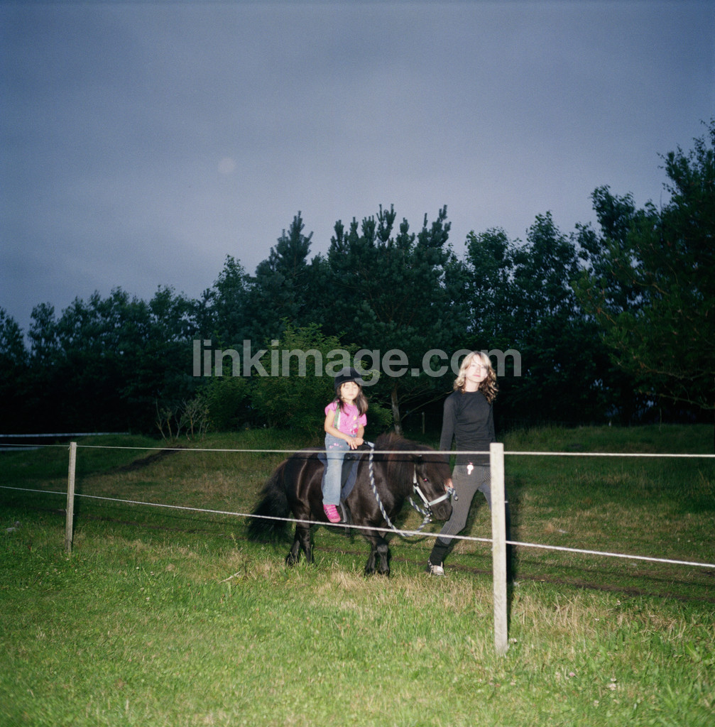 - leisure, adventure, riding, ride, children's activities, pasture, horse, pony, forest, firs, night, girls, leader, children, dusk