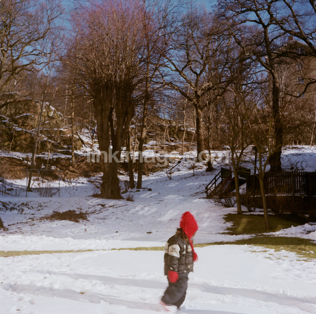 - children, winter, snow, park, hood, red riding hood, winter clothes, alone, sun, go, tree, forest
