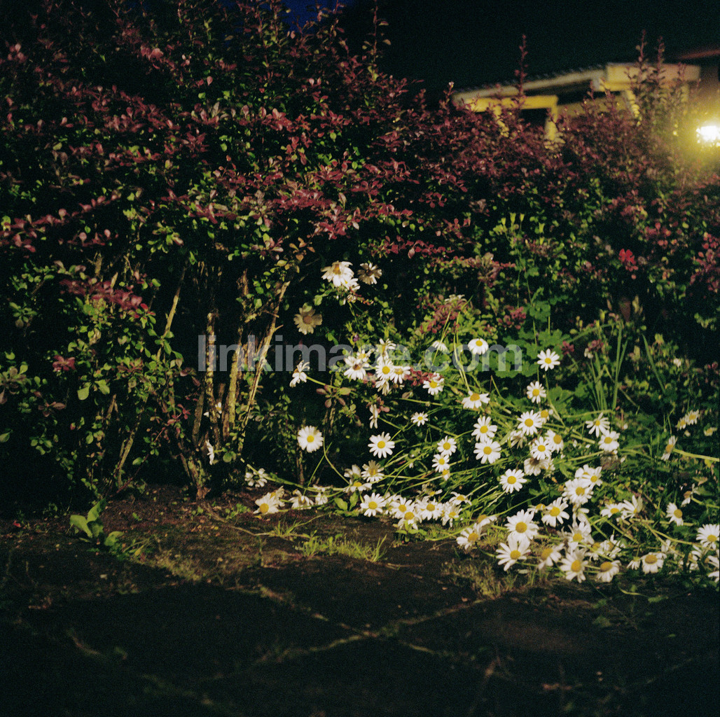 - Night picture of flower and shrub.