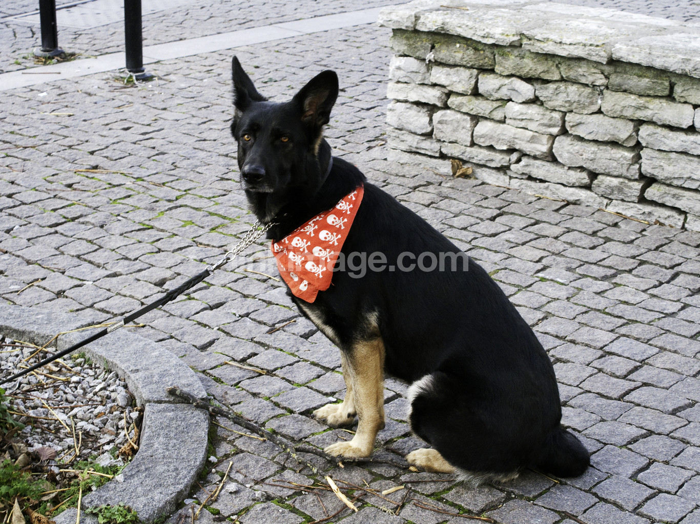 - dog, wait, gaze, scarf, red, skull and crossbones, tough, leash, german shepherd