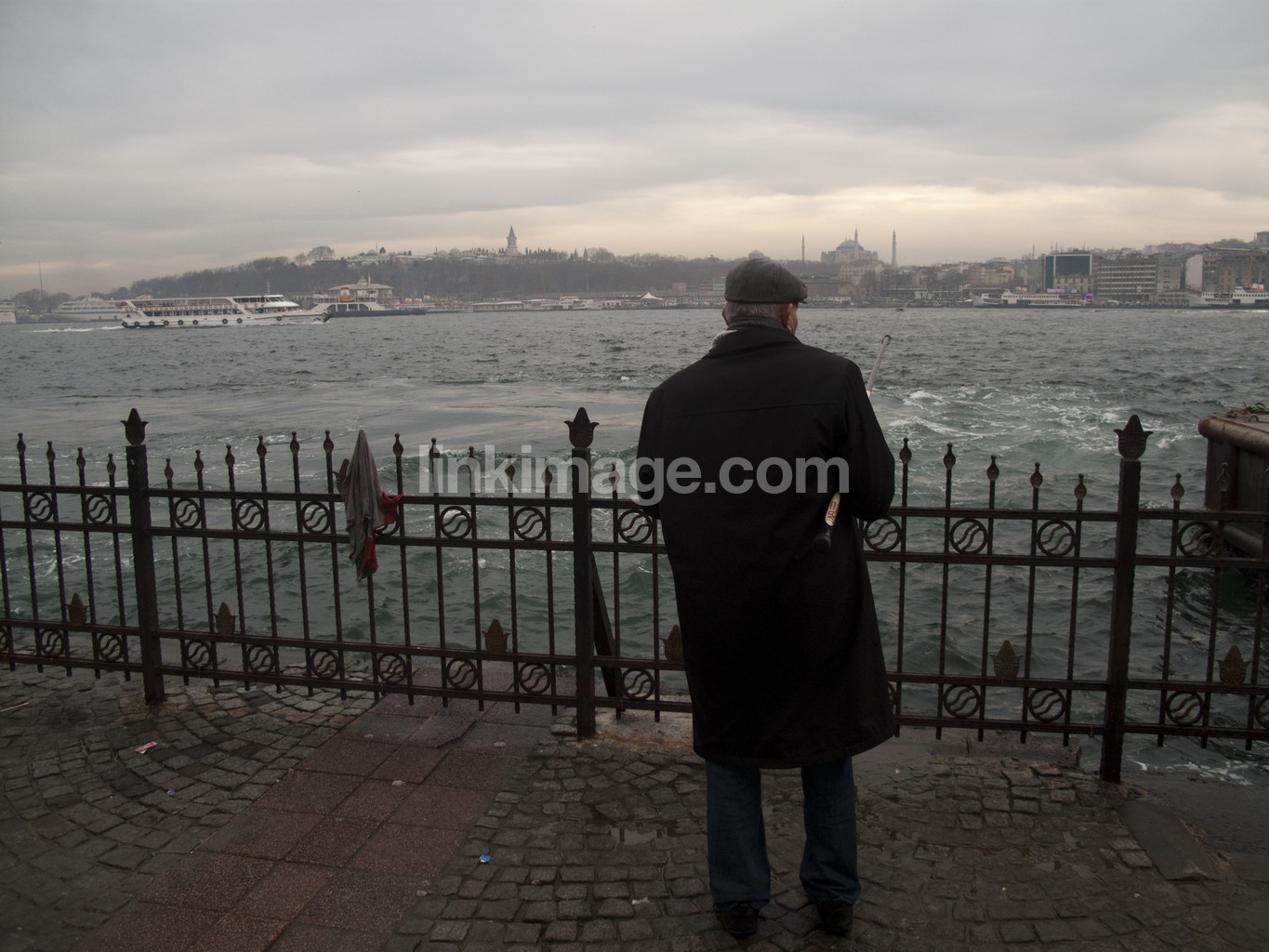 - male, rear, back, basques, hat, fence, water, city, boat, views