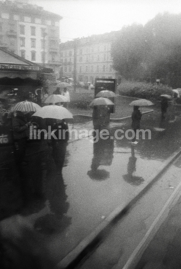 - storm, rain, umbrella, street, people, waiting, kiosk, city life