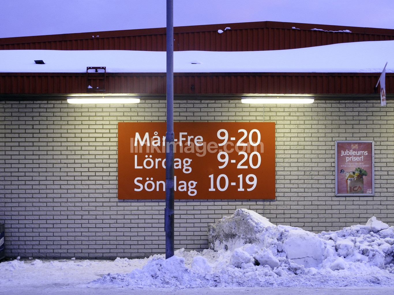 - business, store, weekdays, opening hours, sign, advertising, supermarket, brick wall, winter, snow, snow removal, time, weather, post, brick