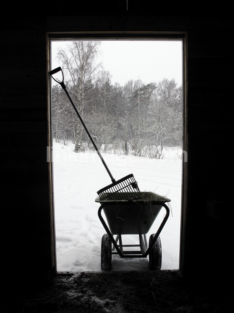 - stalls, suede, horse, horse care, winter, snow, weather, wheelbarrow, doorway, shovel, seized, agriculture, agricultural