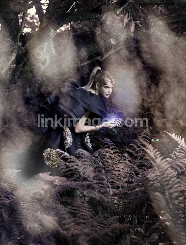 - fashion, girl, forest, fern, longhaired, dressed in black, crouched, dress, mystery, sneak, tax, hässvns, blonde