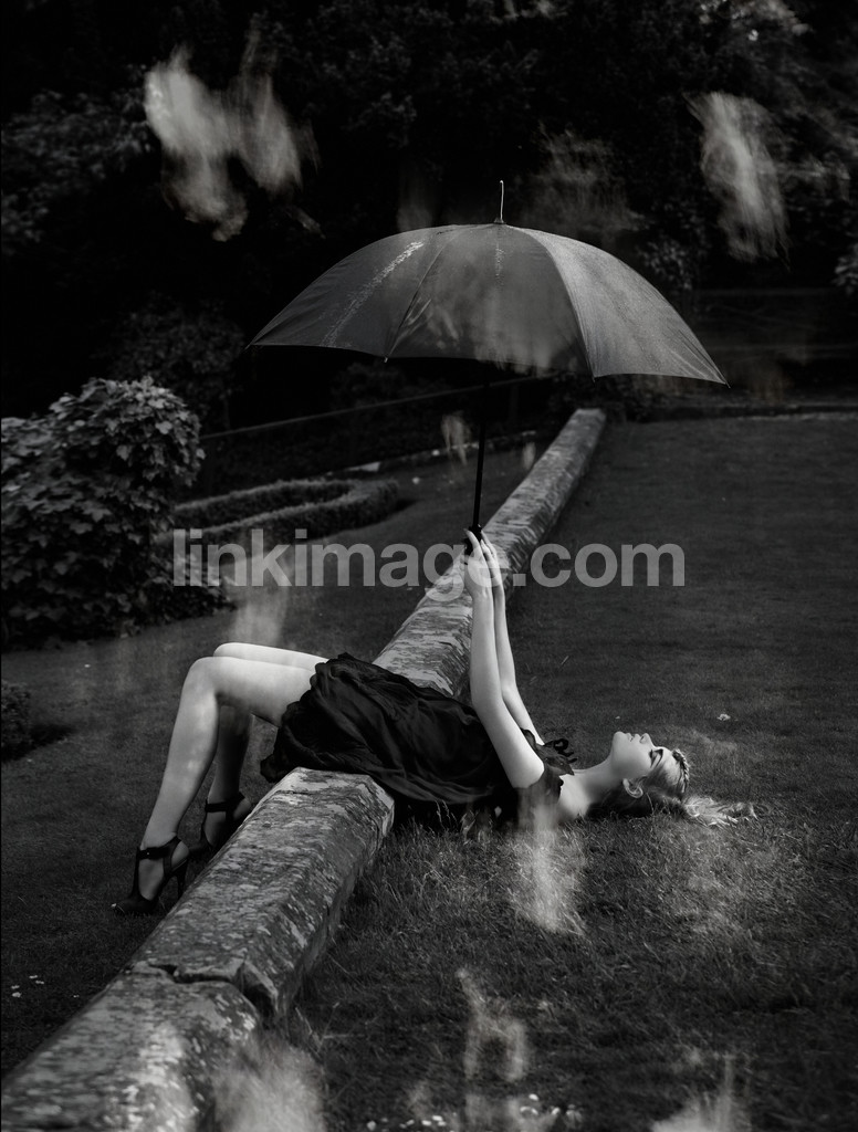 - is, wall, lawn, umbrella, girl, black, dress, high heels, close your eyes, garden, bush, discounts, fashion