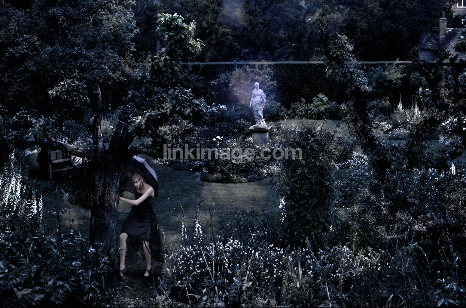 - garden, tree, flower garden, girl, dress, dressed in black, full-length, earring, umbrella, garden furniture, statue, fashion