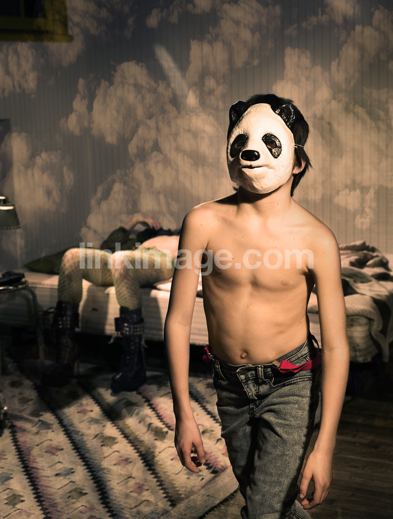 - fashion, boy, girl, cloud, panda, dream, dreaming, mask., solo, siblings, sleep, children, bed