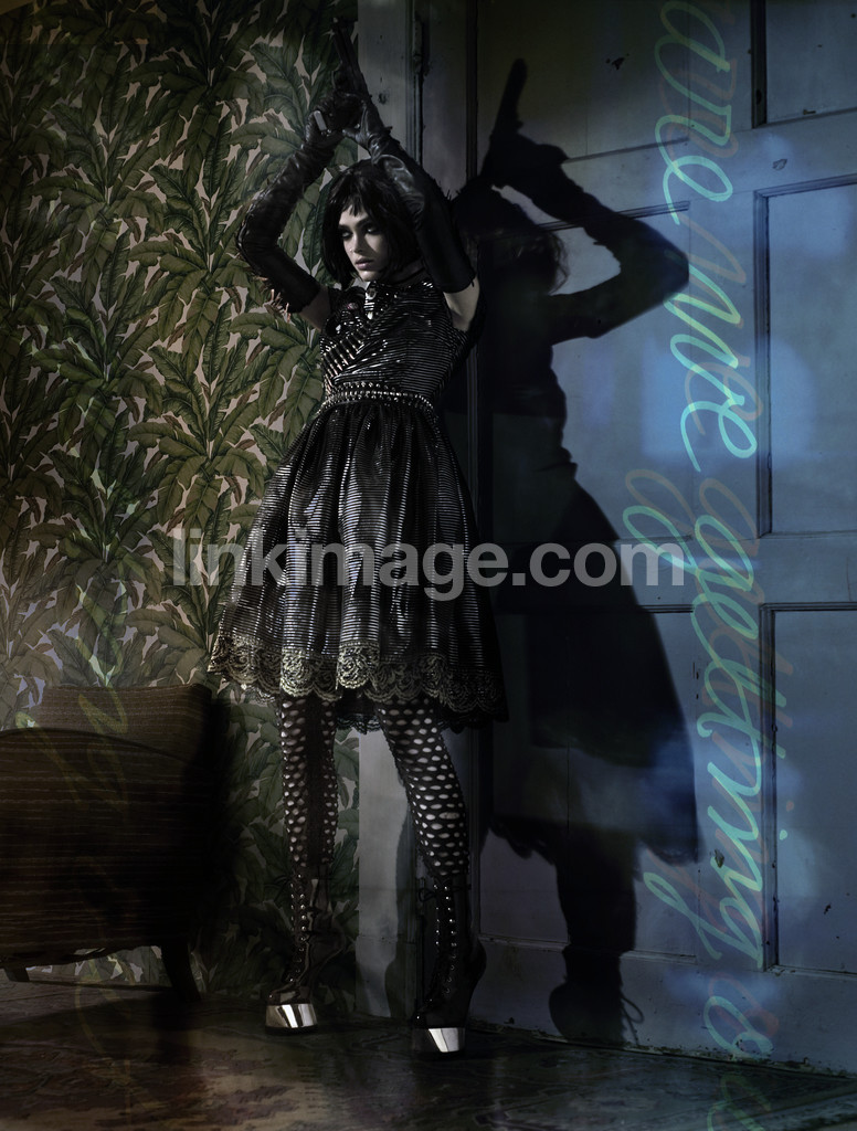 fashion, beauty, gun, female, dangerous, coat, ready, clothes, dress, wig, ammo, leather gloves