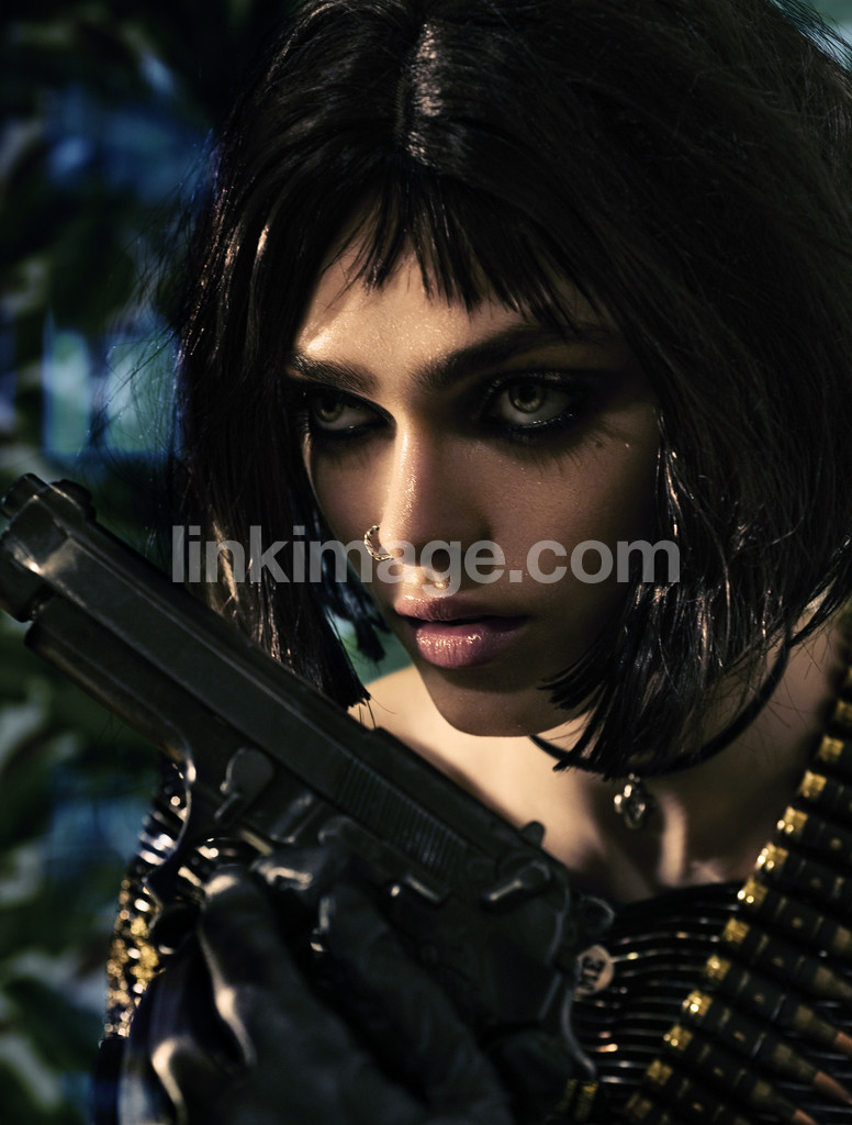- fashion, beauty, piercing, gun, mystery, spy, dangerous, wig, focused, girl, female, teen, coat, ammo