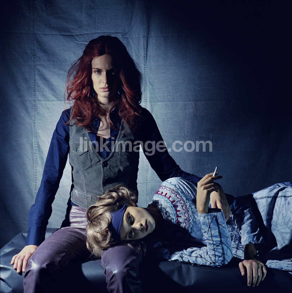 - women, girls, redhead, curls, cig, ciggarett, smoke, puffs, two, sitting, is, west, pattern, hair band, blue, leather