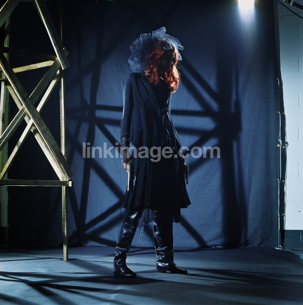 - female, girl, fashion, model, blue, hair, redhead, light, boots, guns, coat, gun, hat, headdress, hard, shadow, tower, wood