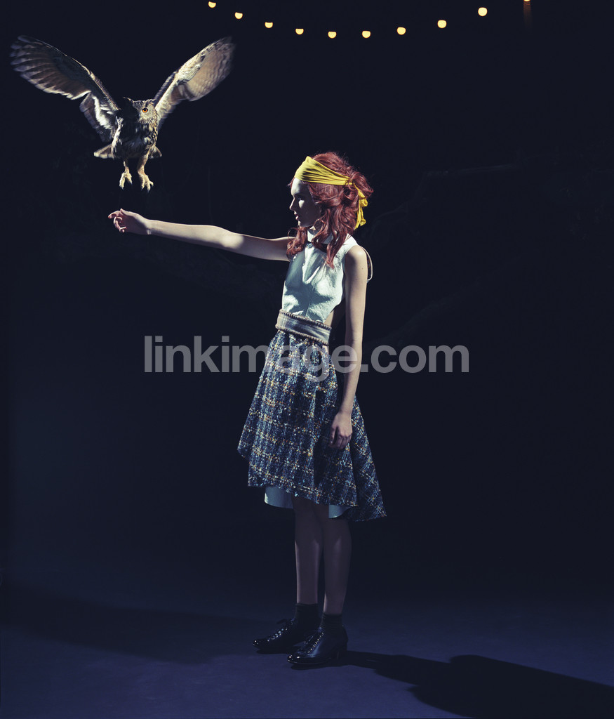- girl, female, girl, fashion, model, redhead, red, rural, bird, predators, falcon, fly, wings, widely, arm, land, light, light strand, checkered, shadow, blue, scarf