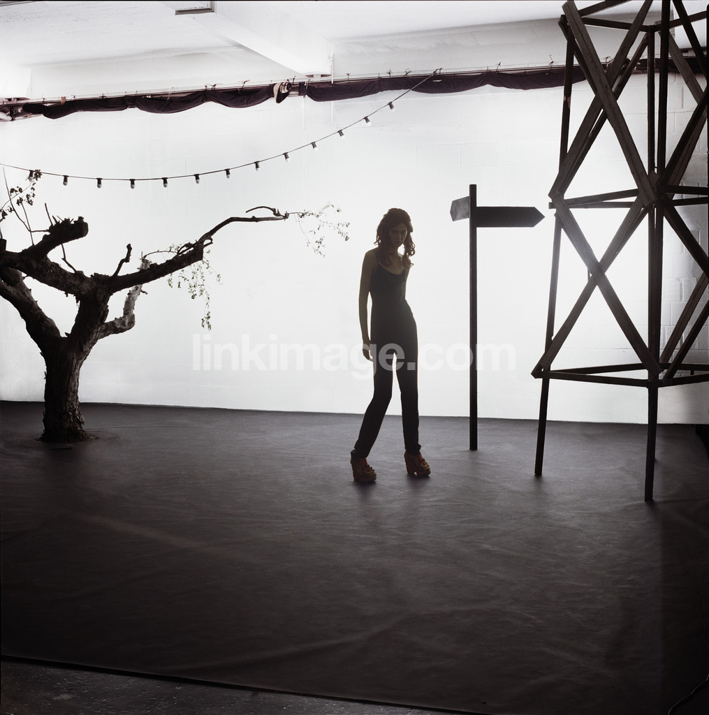- studio, tree, tower, signposts, directive, reference, point, light, light strand, branches, female, girl, fashion, model, black