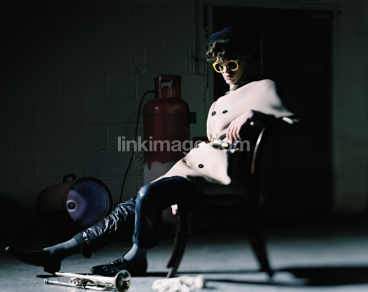 - guy, male, fashion, model, chair, sitting, jacket, yellow, frames, sunglasses, hat, beige, industrial, room, inside, fan