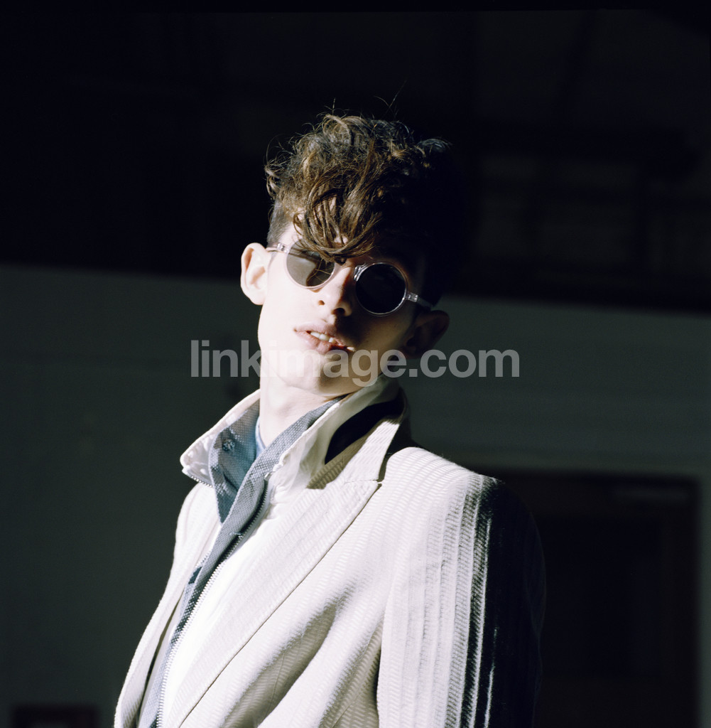 - guy, male, eyeglasses, round, sunglasses, light, shadow, curls, bangs, blazer, costume, shirt, model, fashion