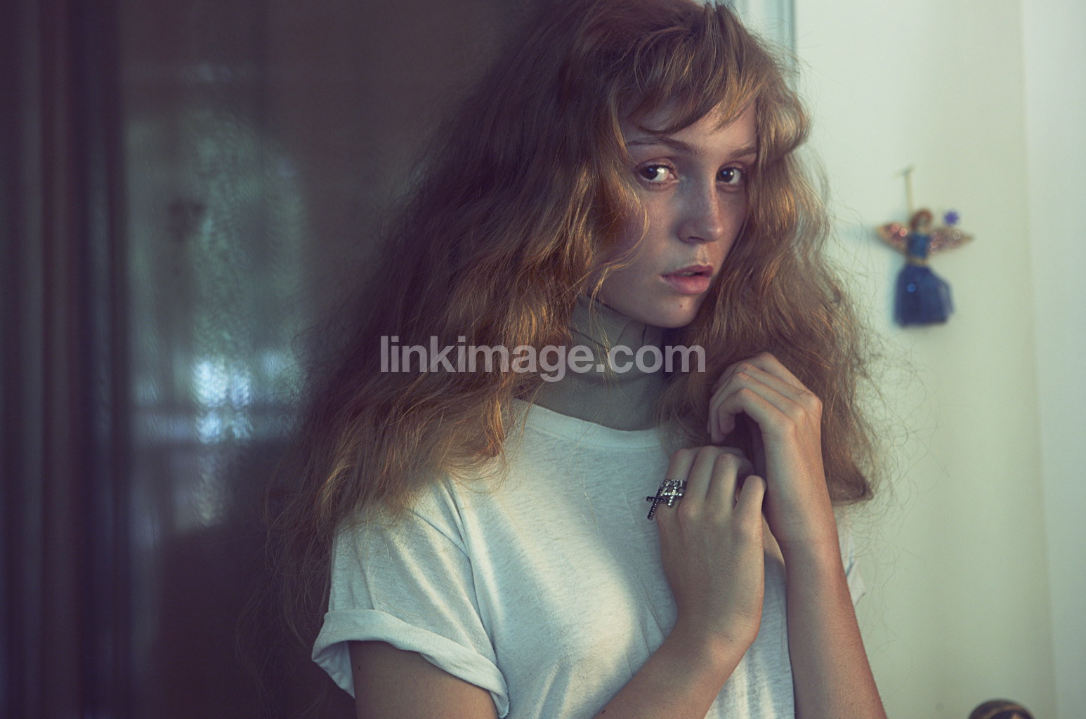 - girl, girl, female, curls, hair, shy, timidly, white, t-shirt, rings, room, inside, young, fashion, model, angel, angelic