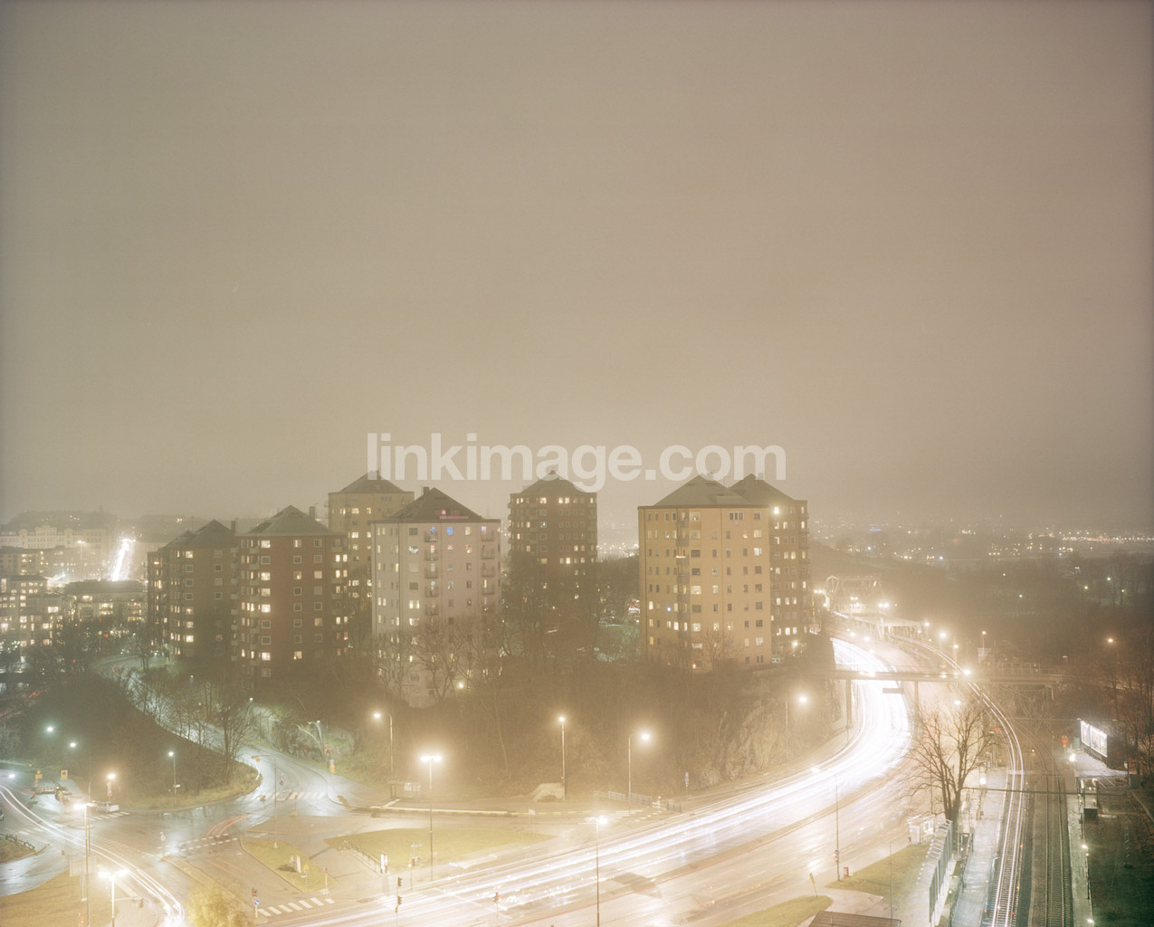 - city, suburb, night, rain, haze, overcast, fall, winter, traffic, exit, peak, rise, brf, apartment building, home, danvikstull, stockholm, nacka, evening, housing
