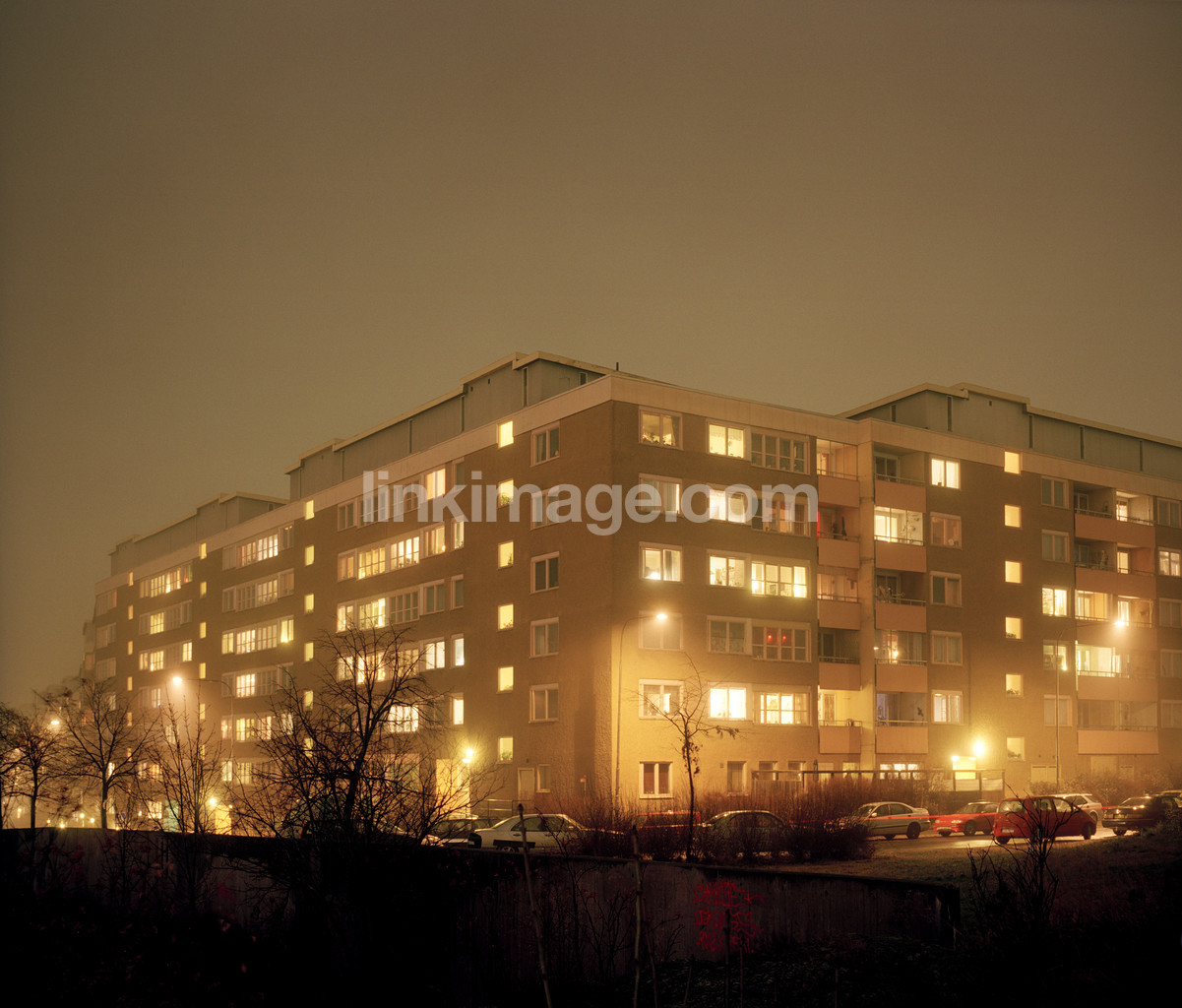 - henriksdalsringen, stockholm, nacka, suburb, apartment building, ghetto, haze, fall, winter, evening, night, hot, yellow, hemme, window, light, parking, cars.