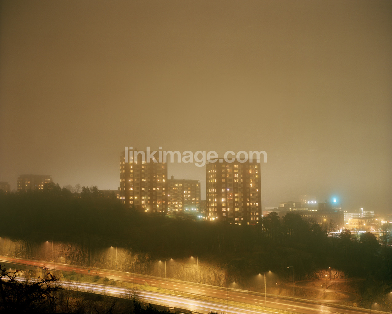 city, rise, suburb, nacka, fall, winter, night, evening, yellow, hot, haze, rain, road, freeway, home