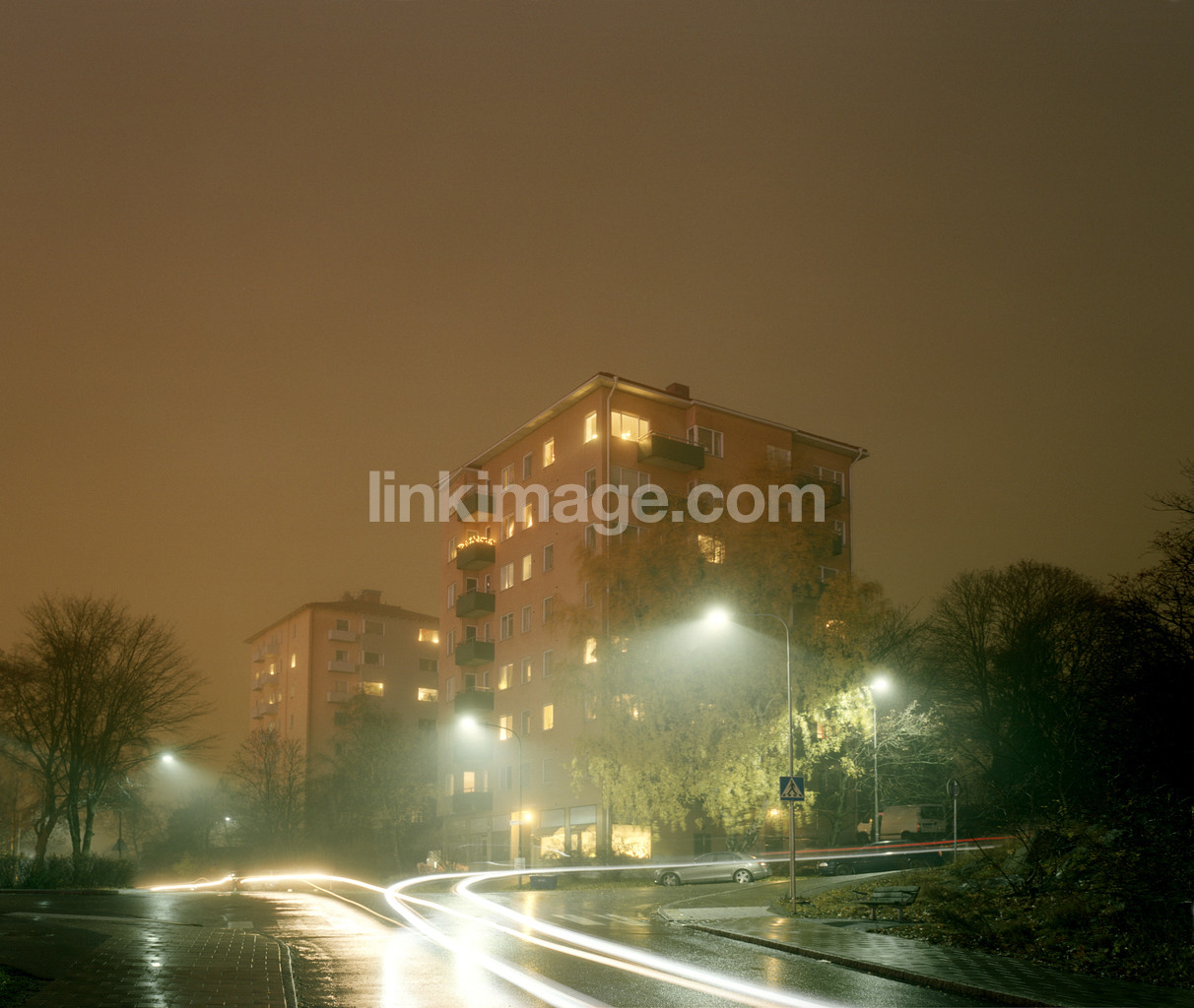 - street, city, suburb, rise, apartment building, traffic, cars, rain, fall, haze, winter, night, evening, streetlights, transition point
