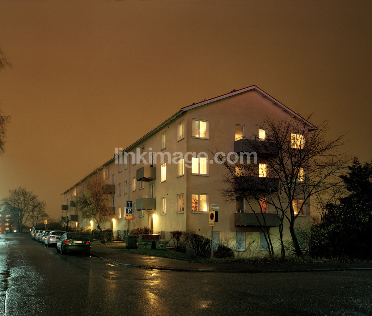 - city, suburb, stockholm, fall, winter, rain, night, evening, yellow, orange, sky, asphalt, house, apartment building, brf, architecture, home, condominium