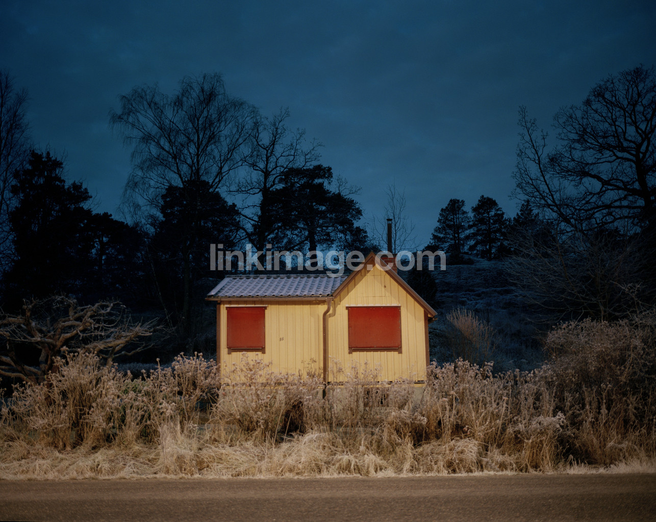 - allotment, garden cottage, night, fall, winter, evening, closed, shutters, cottage, house, garden, yellow, blue, tree, country place, summerhouse, blank, fate, alone