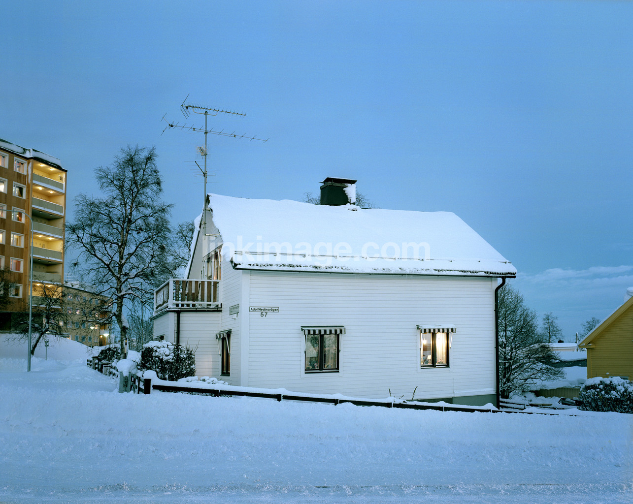 house, villa, small town, kiruna, snow, winter, evening, blue, white, antenna, home, dusk