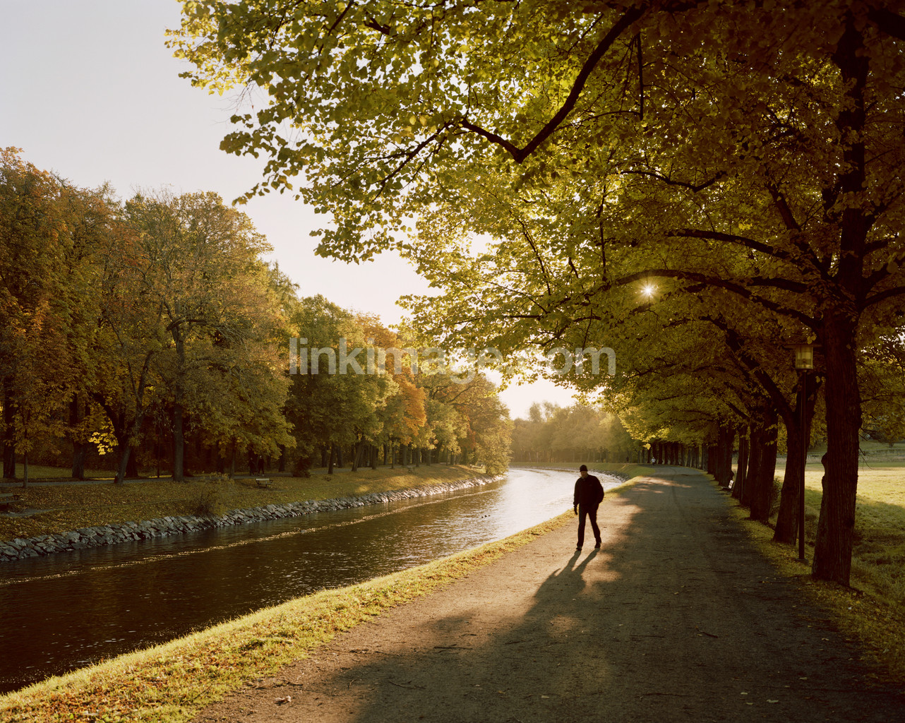 - spot, walkway, tree, leaf, fall, sun, channel, water, exercise, walk, male, health, path, backlight, shadow, forest, park