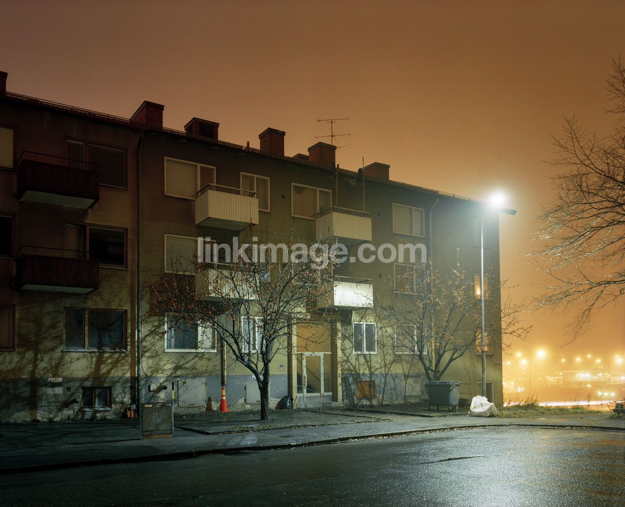 - house, apartment building, housing, home, port, port rise, suburb, city, small town, dreary, empty, fate, architecture, lamppost, rain, orange, asphalt, fall, night, evening