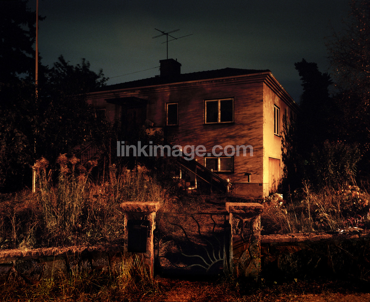 - house, villa, housing, home, suburb, small town, stockholm, blank, fate, alone, scary, terrible, gate, garden, fall, late summer, night, evening, dark, abandoned, lit