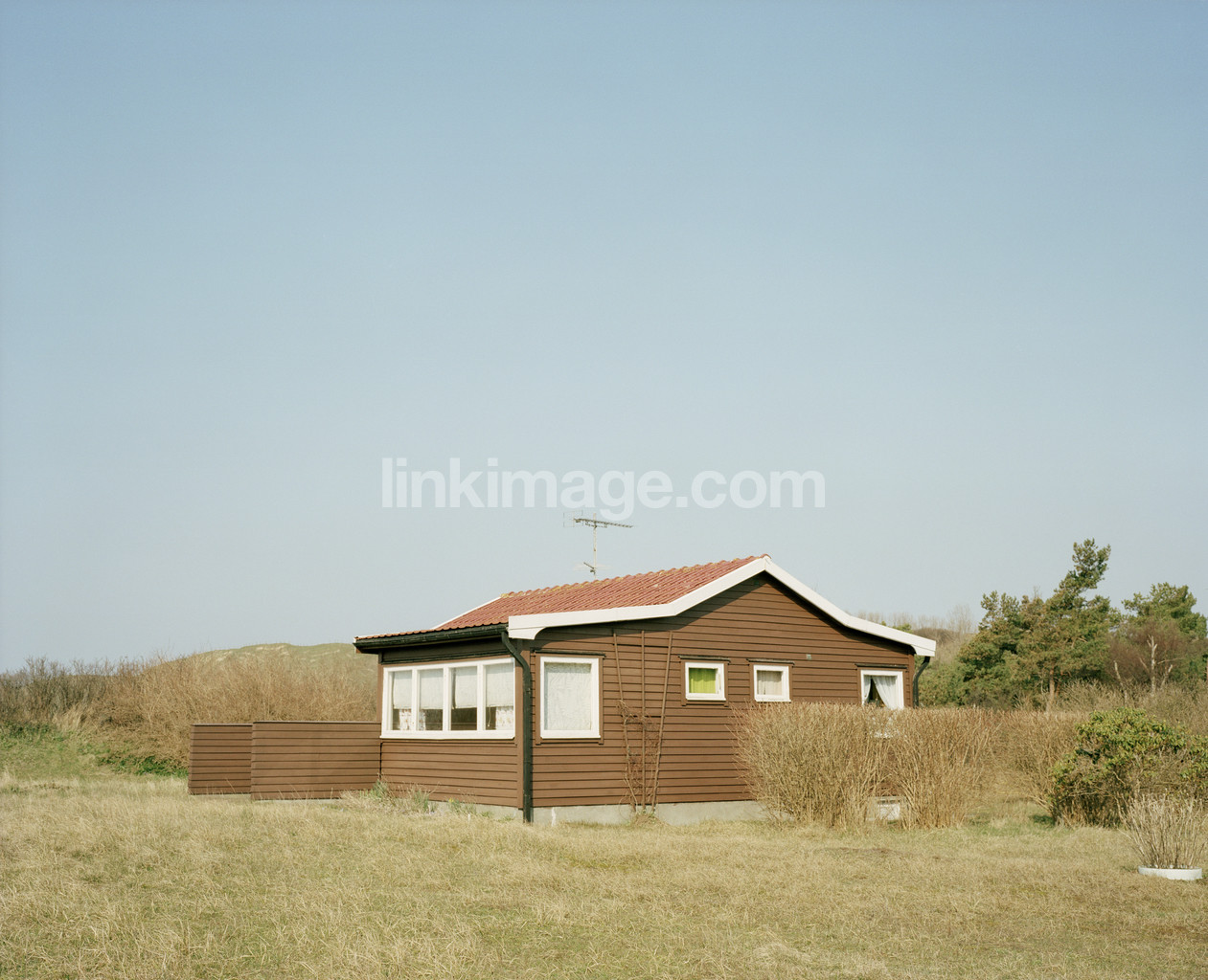 - summerhouse, house, full house, summer place, österlen, panel, wood, brown, small, garden, spring, sun, villa, sky, grass, lawn